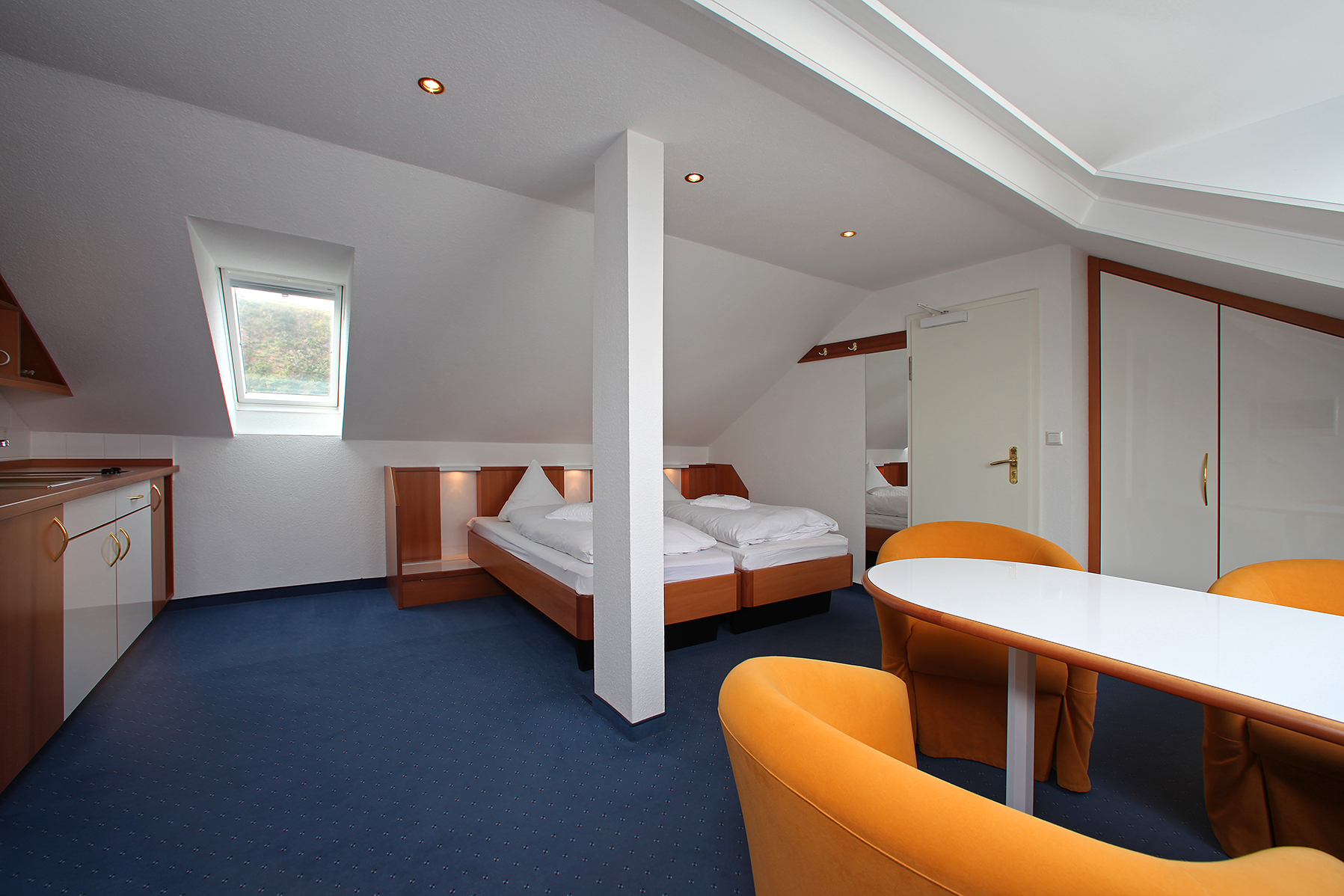 Dieses Ein-Raum-Appartement in der Mansarde des HAUS RUNGHOLT bietet Platz für bis zu drei Personen. Genießen Sie von hier aus den Blick auf das Meer und den Falm.