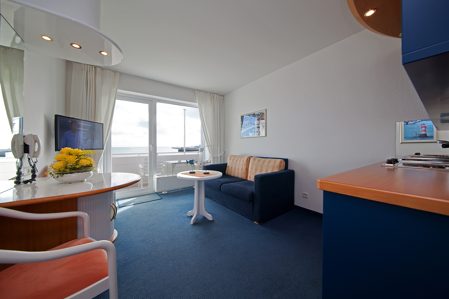 Appartement 1, 3 und 5 in unserem Appartementhaus. Das gemütliche Schlafzimmer ist zur Falmseite ausgerichtet, der Wohn- und Essbereich zur See. Dank des ausziehbaren Sofas im Wohnzimmer kann dieses Zimmer von 2-4 Personen belegt werden.